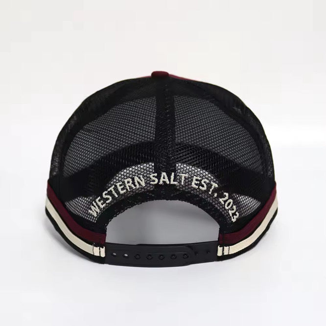 Our Western Salt Maroon Hat features two toned colour bands, a wheat and wave decal on the top left, and our digital printed logo pattern underneath the brim! The 3D front logo adds the perfect finishing touch. Made with high quality materials for ultimate comfort and lasting style. Sized to comfortably fit larger heads, yet still adjustable for ALL! Measures 9.5cm in height and fits head circumferences up to 58cm.